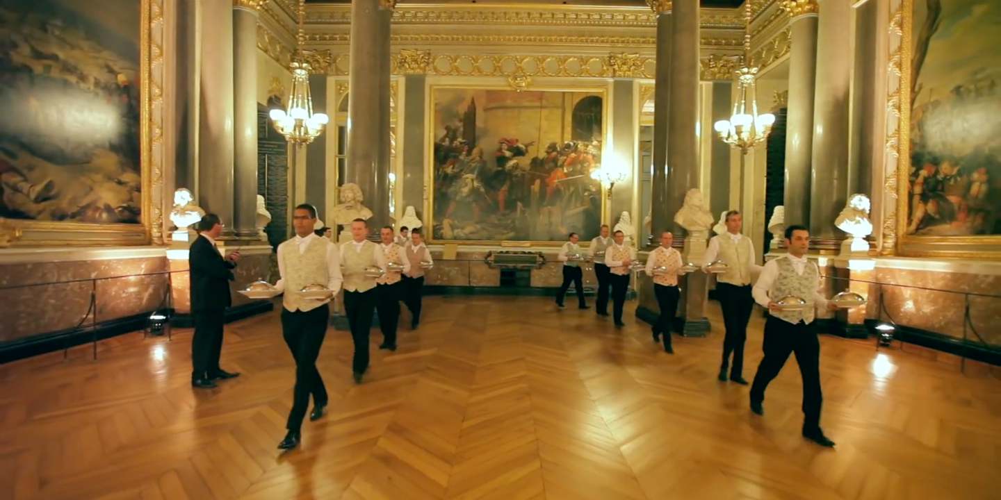 Au fil des minutes, sur des airs de Lully (notamment la Marche pour la cérémonie des Turcs), on voit Carlos Ghosn, tel le Roi-Soleil, accueillir ses convives, parmi lesquels on croise Jeff Bezos, le patron d’Amazon, le chef étoilé Alain Ducasse, l’épouse de l’ancien premier ministre britannique Cherie Blair, l’écrivain franco-libanais Amin Maalouf ou l’acteur français François Cluzet. Tous sont conviés à un cocktail suivi d’un dîner aux chandelles servi dans la galerie des Batailles, entourés de figurants et de musiciens costumés.