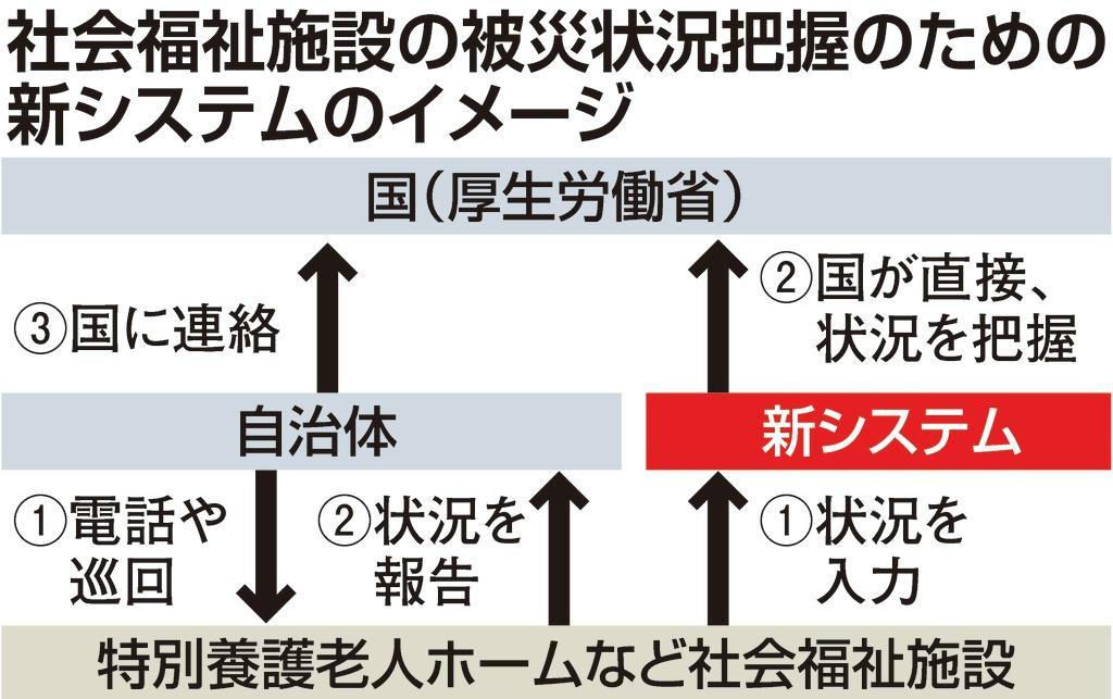 ただ、今秋の台風15、19号のような大規模災害では迅速な対応が不可欠。このため新たなシステムを構築し、施設職員らがスマートフォンやパソコンを使って被害状況や支援が必要であることを入力すれば、厚労省がすぐに情報をつかめる体制を整える。