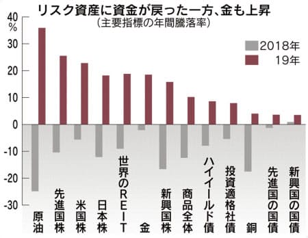 年明けすぐの1月4日、米連邦準備理事会(FRB)が引き締めの停止を示唆すると、世界の金融市場の空気は一変。結局、今年は3回利下げしたFRBをはじめ50以上の中央銀行が緩和拡大に動いた。緩和相場が復活し、幅広い資産が値下がりした18年とは正反対の動きとなった。