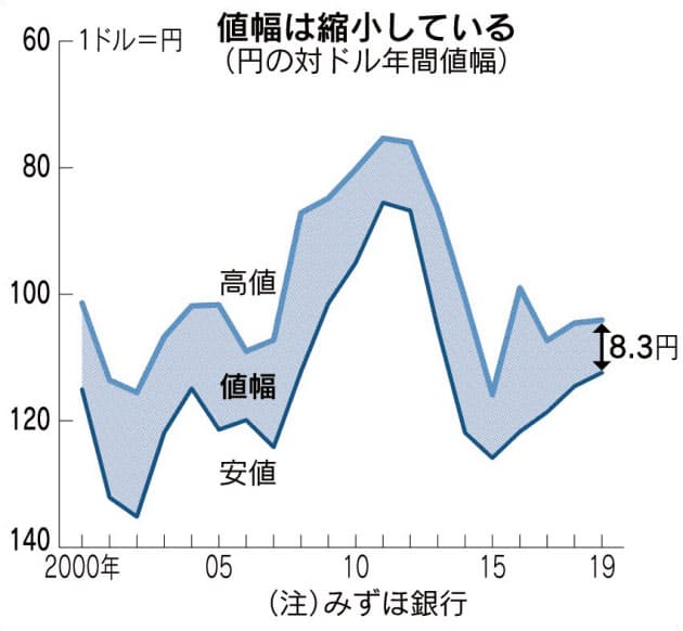 日米欧で為替相場が動かなくなっている。2019年の円の対ドルの値幅(高値と安値の差)は24日時点で8円30銭にとどまり、2年連続で過去最小を更新する見通しだ。ユーロとドル、ユーロと円でみても値幅は最も小さくなりそうだ。世界的な低インフレと低金利が続く「低温経済」に加え、電子取引の普及なども「動かぬ為替相場」を生み出している。…