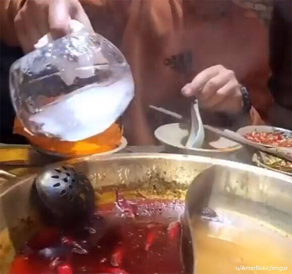 海外掲示板で話題となっていたのは、氷を使って鍋に浮いた油を取る方法だ。確かにこれなら簡単に一気にとれるかもしれない。