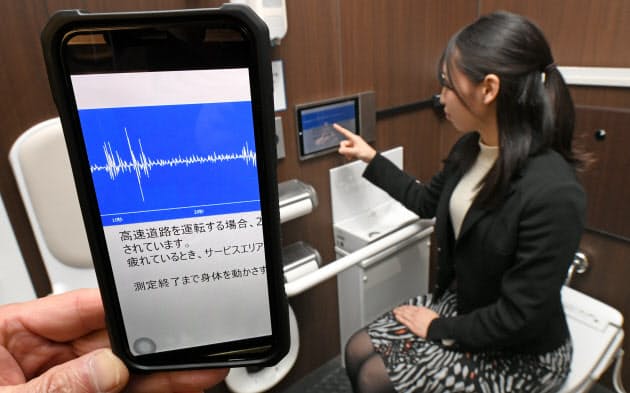 「現在の疲労度は『疲れていない』です」。東名高速道路の海老名サービスエリア(SA)。トイレに座ってボタンを押すと、画面に心拍…