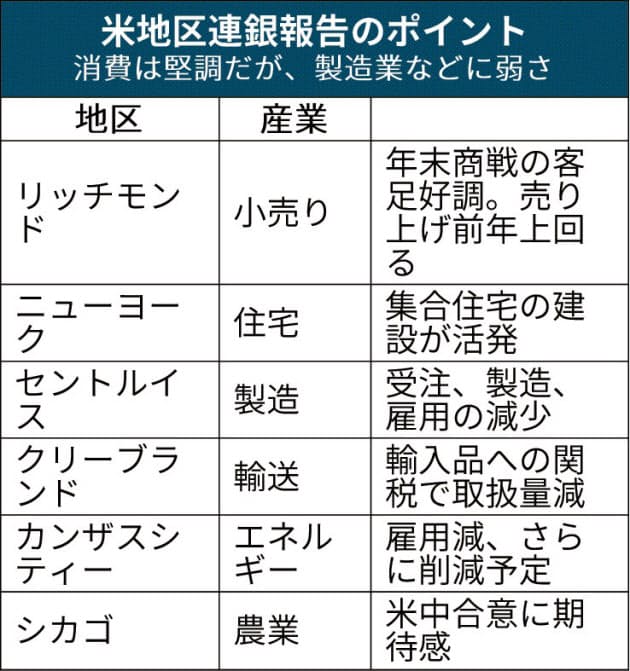 【ワシントン=長沼亜紀】米連邦準備理事会(FRB)が15日発表した地区連銀経済報告(ベージュブック)は、2019年11月中旬から年末にかけて米経済は「緩やかな拡大が続いた」と総括し、前回と同じ景況判断を維持した。堅調な消費が製造業の弱さを補い、貿易をめぐる不透明感が依然一部で残っているものの「見通しはそこそこ明るい」とした。