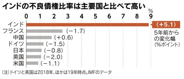 インドに金融不安の足音が迫っている。将来の貸し倒れリスクが高い「不良債権予備軍」の債務の比率は全体の2割を超え、この10年で2倍以上となった。国営銀行がずさんな融資から不良債権を増やし、ノンバンク大手の経営危機が相まって金融が目詰まりした。インドの金融システム(総合2面きょうのことば)で発生した信用不安が景気低迷に拍車をかけ、経済は持ち直しの兆しがみえない。
