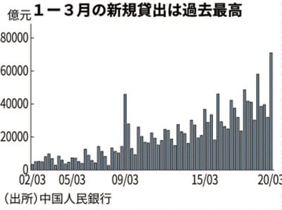 企業の倒産急増を防ぐため、元本や利息の返済延期に柔軟に応じるよう銀行に求め、3月末までに計8800億元の返済を繰り延べた。当局主導で計1.8兆元の低利融資枠を設けたこともあり、1~3月の新規貸し出しは7.1兆元に達した。