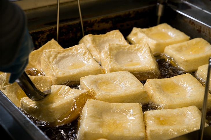 その美味しさの秘密はこだわりの原料と、豆腐生地のつくり方と揚げ方にあります。まず国産大豆、竹田の清水、越前の海で採れた天然にがりでおあげ用の豆腐を作ります。その豆腐をじっくりと時間をかけて、丁寧に揚げていきます。これにより、外はカリッと、中はふんわりした食感と風味豊かな「おあげ」が出来上がるのです。