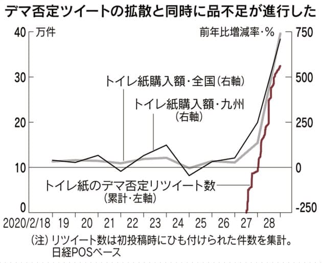 デマを打ち消そうとする投稿の急増が、意図せぬ形で逆に社会を混乱させていた。2月末から全国に広がったトイレットペーパーの買い占め騒動に関し、ツイッター上の投稿と商品の販売状況を分析すると、意外なメカニズムが浮かんだ。当初は「主犯」とされたデマ投稿は実は拡散していなかった。ネット上の情報が現実社会に及ぼす影響は複雑さを増している。